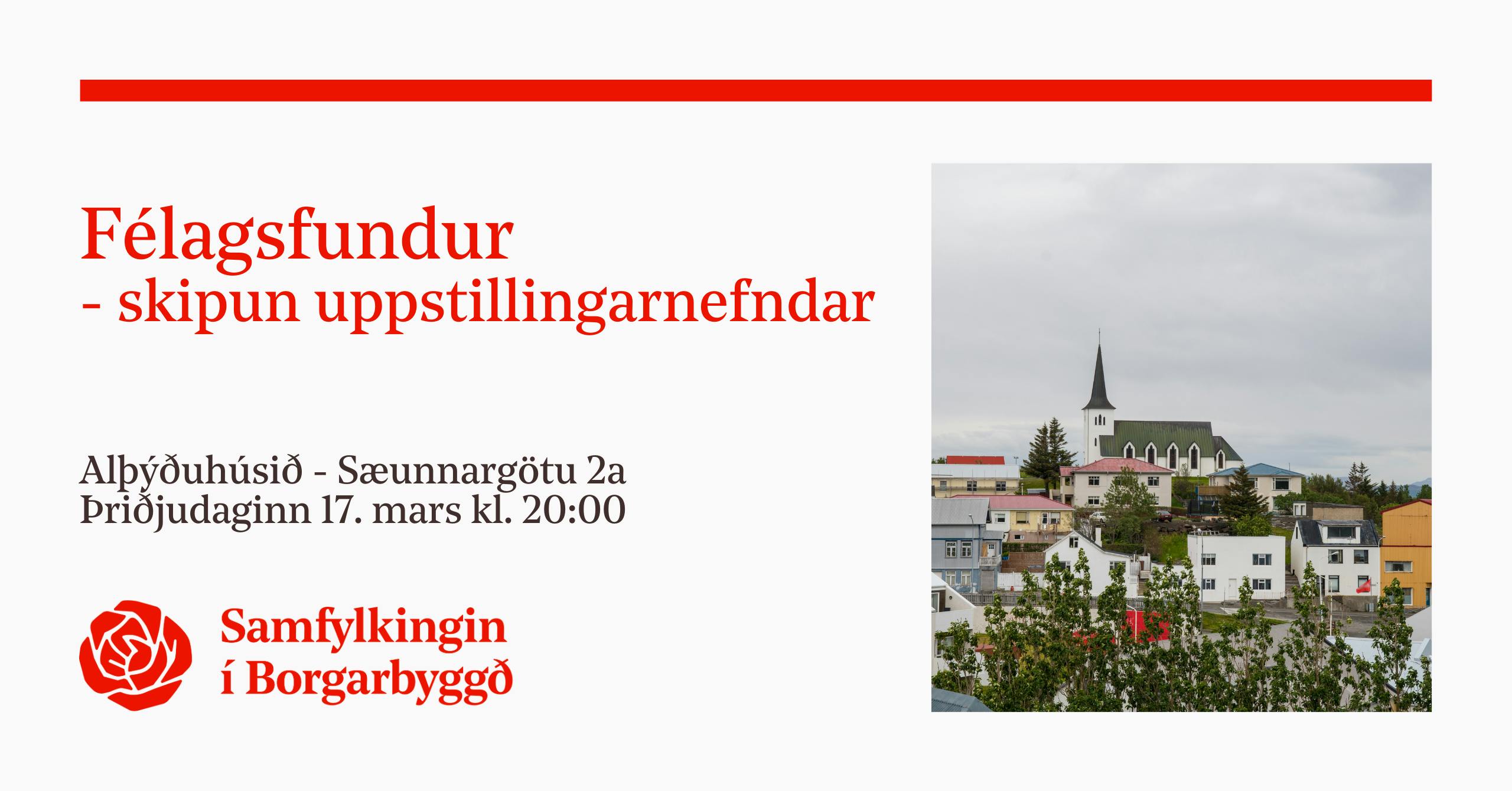 17. mars 2026 kl. 20:00 – 21:00– Alþýðuhúsið, Sæunnargötu 2a - BorgarnesFélagsfundurSamfylkingarfélagið í Borgarbyggð boðar til félagsfundar þriðjudaginn 17. mars kl. 20:00 í Alþýðuhúsinu, Sæunnargötu 2a.Efni fundarins er skipun uppstillinganefndar fyrir sveitarstjórnarkosningarnar 16. maí nk.Öll velkomin.